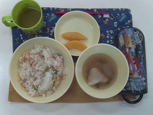 シーフードピラフ 水餃子スープ 果物