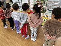 縄跳びの後のゆり組さん。今月半ばにある「お店屋さんごっこ」のための寿司つくり!!