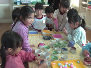 今日は年少少つぼみ組さんが、年長ゆり組さんの品物作りを見学に行きました! 来週のお店屋さんごっこに向けて、ゆり組のお兄さん・お姉さんは一生懸命です。 おかしやさんのケーキやマカロン、おしゃれやさんの時計、ゲームやさんの飛行機などなど、買いたいもの欲しいものがいっぱ~い。 上手に作っているお兄さん・お姉さんを見て、尊敬のまなざしを送るつぼみ組さん♪ 先生から、パッチン […]