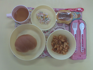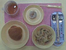 ロールパン・ペンネミートソース・大根サラダ・チーズケーキ